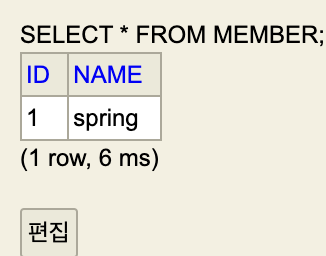 insert into member(name) values('spring') 이라는 insert문으로 데이터를 넣어보겠습니다.