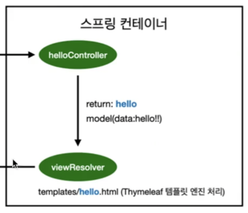 -컨트롤러에서 리턴 값으로 문자를 반환하면 뷰 리졸버( 'viewResolver' )가 화면을 찾아서 처리합니다. 이 viewResolver는 기본적으로 스프링 부트 템플릿엔진 기본 viewName에서 매핑합니다.