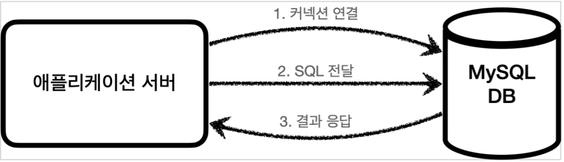 클라이언트가 애플리케이션 서버를 통해 데이터를 저장하거나 조회하면, 애플리케이션 서버는 다음 과정을 통해서 데이터베이스를 사용한다.