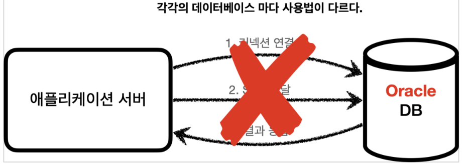 - 개발자가 각각의 데이터베이스마다 커넥션 연결, SQL 전달, 그리고 그 결과를 응답 받는 방법을 새로 학습해야 한다.