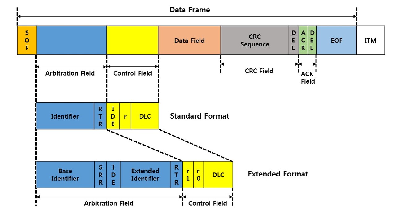 CAN에서는 데이터 프레임(data frame), 리모트 프레임(remote frame), 에러 프레임(error frame), 오버로드 프레임(overload frame)의 4가지 프레임 타입을 정의하고 있다. 데이터 프레임은 일반적으로 데이터 전송에 사용되며, 리모트 프레임은 수신할 노드에서 원하는 메시지를 전송할 수 있는 송신 노드에게 전송을 요청할 때 사용된다. 에러 프레임은 메시지의 에러가 감지되었을 때 시스템에 알릴 목적으로 사용된다. 마지막으로 오버로드 프레임은 메시지의 동기화를 목적으로 사용된다. CAN 통신에서 데이터 송수신은 메시지 프레임을 사용하여 이루어진다. 메시지 프레임의 구조는 다음과 같다.