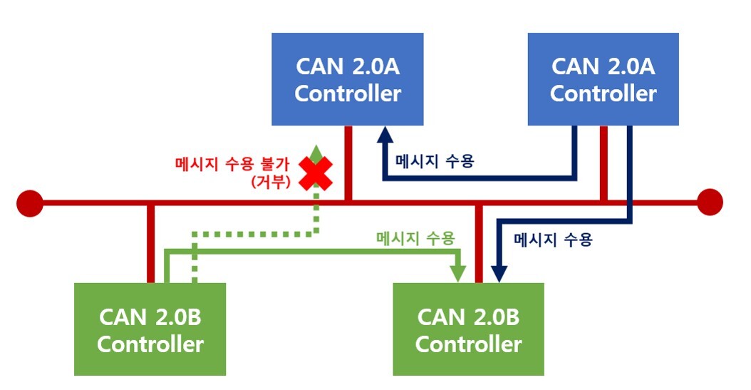 대부분의 CAN 2.0A 컨트롤러는 오직 표준 CAN 포맷의 메시지만 전송 및 수신이 가능하며, 확장 CAN 포맷(CAN 2.0B)의 메시지를 수신하더라도 그 메시지를 무시해 버린다. 즉, CAN 2.0A 컨트롤러에서 보내온 메시지 데이터만 유효하다. 그러나 CAN 2.0B 컨트롤러는 양쪽 메시지 포맷(CAN 2.0A, CAN 2.0B)에 대해 모두 송수신이 가능하다.