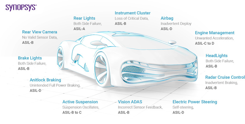 에어백, 잠금 방지 브레이크 및 파워 스티어링과 같은 시스템은 고과 관련된 위험이 가장 높기 때문에 안전 보증에 적용되는 가장 엄격한 ASIL-D 등급이 필요하다. 안전 스펙트럼의 다른 쪽 끝에서 후방 조명과 같은 구성 요소는 ASIL-A 등급만 필요하다. 헤드 라이트와 브레이크 라이트는 일반적으로 ASIL-B이고 크루즈 컨트롤은 일반적으로 ASIL-C이다.