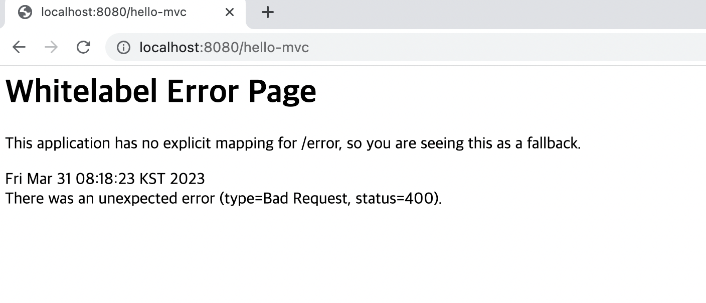 실행해주고 localhost:8080/hello-mvc에 들어가보면 다음과 같이 에러 페이지가 뜹니다.