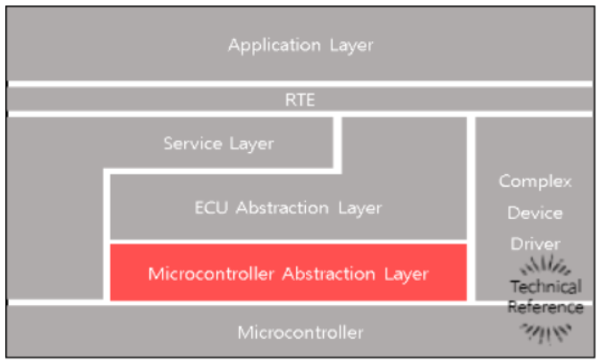 AUTOSAR 플랫폼에서 가장 낮은 계층이다. 마이크로 컨트롤러(MCU) 종속적으로 개발되어 상위 계층에 MCU 자원 또는 기능을 활용하기 위한 Device Driver API를 제공하는 계층이다. MCAL이라고 부르며 경우에 따라 BSW와 별개로 구분 짓기도 한다. 마이컴 드라이버, 메모리 드라이버, 통 신 그리고 IO 드라이버를 포함한다.