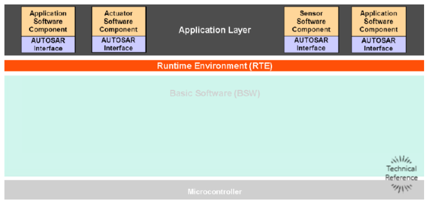 AUTOSAR 플랫폼의 구조는 계층화된 아키텍처(Layerd Architecture) 구조이며, 크게 위에서부터 ASW, RTE, BSW로 구성된다. 하위 계층들은 특정한 수준의 추상화를 상위 계층에 제공한다.