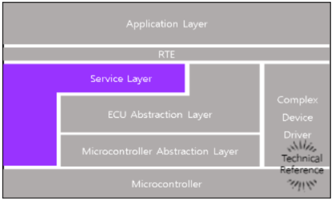 Service Layer는 BSW에서 가장 위에 있는 계층이다. I/O 하드웨어로의 접근이 ECU 추상화 계층에 의해 관리되는 동안 Sevice Layer는 다음과 같 은 시스템 구동 및 BSW 내 모듈들의 전반적인 제어를 위한 다양한 백그라운드 기능(통신, 메모리, OS)을 제공한다.
