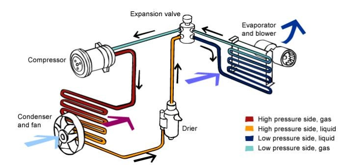 냉매를 압축하는 이유는 높은 온도에서 기체를 액체로 액화시킬수 있기 때문인데, 자동차에 사용되는 냉매는 보통 대기압인 1기압에서는 -29.8도씨에서 액화한다.