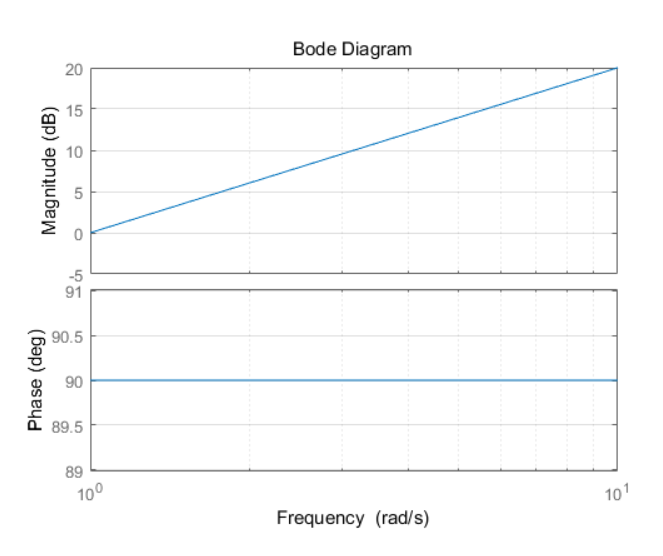 예를 들어, 미분기의 전달함수를 통해 이해해보자. 미분기의 전달함수는 s이다. 미분기의 FRF(Frequency Response Function)을 보면 아래 그림처럼 표현이 된다.