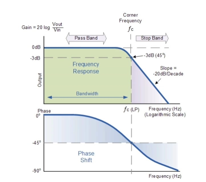 여기서 신호의 주파수가 차단주파수보다 매우 작다면 τω≪1 이므로 LPF의 크기는 1이다 (신호의 세기가 변화없이 그대로 출력). 그리고 신호의 주파수와 차단 주파수가 같게 된다면 τω=1 이 되기 때문에 크기가 약 0.707(1/√2)이 되는데 이 값을 dB단위로 바꾸면 -3.01dB이 된다. 그래서 LPF의 대역(Bandwidth)를 크기가 -3.01dB이 되는 주파수로 정의한 것이다.